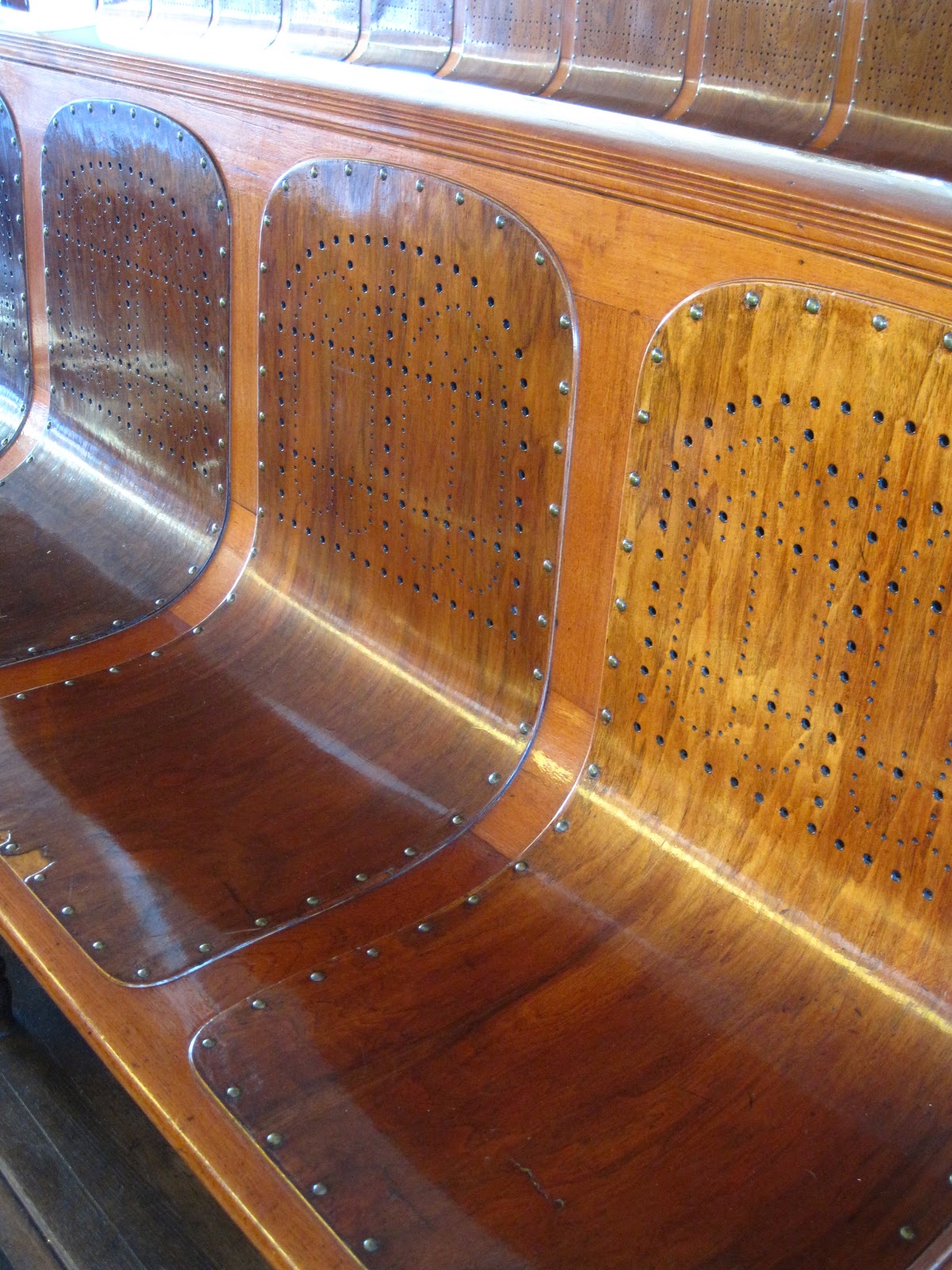 Mom taking a seat on a pretty bench inside a Steam Ferry that acted as both a ship to tour as well as a small museum of sorts...